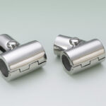 Kaidehela ruostumatonta terästä, 90° putkihela. Avattava, kolme ruuvia sisältyvät hintaan. Ø 1″ -putkelle.