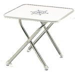 Kansipöydässä valkoinen melamiinipinta, alumiinilista kiertää pöydän reunaa. Kokoontaitettava. Levynpaksuus 16 mm, pöydän korkeus 49 cm.