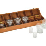 Setti sisältää 6 kpl snapsilaseja ja 6 kpl viskilaseja tiikkisalkussa.