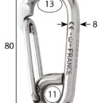 316L-luokan ruostumaton teräskarbiinikoukku kiinnityssovelluksiin. Varustettu silmukalla punoksen tai jatkeen kiinnittämiseen.