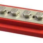 Kytkentäkisko suurille virroille, kisko on tinattua messinkiä ja se on eristetty nailonjalustalla. Kiinnityspultit ovat ruostumatonta terästä. 4 x 50 mm2, punainen. Pulttikoko M8