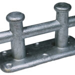 Galvanoitu laituripollari. Pohjalaatta 235 x 90 mm, korkeus 115 mm. Kuusi ruuvireikää.