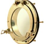 Laivaikkuna kiillotettua messinkiä, lasin halkaisija 200 mm, ulkohalkaisija 235 mm, seinän paksuus 50 mm.