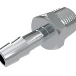 Teräksinen letkuliitin pyyhkijäjärjestelmään. Toisessa päässä on G1/4-liitäntä ja toisessa päässä 1/4-letkuliitäntä.
