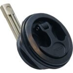 PERKO luukunkiristin ilman lukitusta. Nailonpesän halkaisija 75 mm, musta nostokahva. Lukitusvarren säätömahdollisuus 50 mm, luukun paksuus maks. 20 mm.