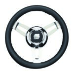Ohjauspyörän ulkokehys mustaa nahkaa, krominen keskiö. Ø 350 mm.