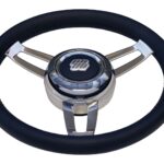 Ohjauspyörän ulkokehys mustaa nahkaa, krominen keskiö. Ø 350 mm.