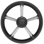 Viisipuolainen ohjauspyörä, joka on pinnoitettu iskunkestävällä polyuretaanilla. Täyttää UKCA-standardit. CE- ja NMMA-sertifioitu.