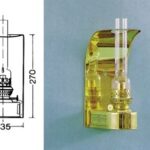 Korkealuokkainen öljylamppu kiillotettua ja lakattua messinkiä. Seinäkiinnikkeellä. Pyöreä poltin 14″, lampun lasi 14″ x 210 mm. Paloaika noin 40 tuntia. Valaisin soveltuu myös pöytälampuksi.