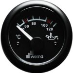 Öljynlämpötilamittari 120 ° . Asennus- Ø 52 mm, asennussyvyys 62 mm, kokonais- Ø 62 mm. Vakiona punainen ja keltainen taustavalaistus. Käyttöjännite 12/24V. Musta pohja / musta kehys.