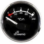 Öljypainemittari 5 kg. Asennus Ø 52 mm, asennussyvyys 62 mm, kokonais- Ø 62 mm. Vakiona punainen ja keltainen valaistus. Käyttöjännite 12/24V. Musta pohja, kehys ruostumatonta terästä.
