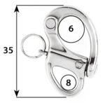 Wichard skuuttihaka 50 mm. Korkealaatuisesta haponkestävästä 316L-teräksestä valmistettu valettu pikakiinnike, joka on suunniteltu kestämään vaativimmatkin käyttöolosuhteet. Kiinteällä silmukalla varustettu malli on luotettava valinta tilanteisiin, joissa vapaata pyörimistä ei tarvita.