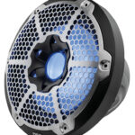Musta, vesitiivis subwoofer-elementti RGB-valoilla ja huimalla 600 W tehonkestolla. IP65-luokitus.