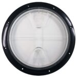 Muovinen tarkastusluukku, musta kehys ja läpinäkyvä kansi.
