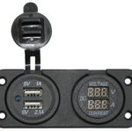 Digitaalinen volttimittari/USB-latauspaneeli. USB-laturi kahdella ulostulolla (A) sekä jännitemittari.
