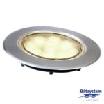 Erittäin matala malli 15 mm. Tarvitaan ainoastaan sopivan kokoinen asennusreikä Ø 60 mm ja kiinnitys tapahtuu kumisella kiinnityskauluksella painamalla valaisin paikoilleen. Kokonais halkaisija 75 mm. Harjattu.