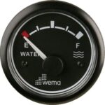 Vesitankkimittari S3/S5-antureille, 0-190 Ω. Asennus-Ø 52 mm, asennussyvyys 62 mm, kokonais-Ø 62 mm. Vakiona punainen ja keltainen valaistus. Käyttöjännite 12/24 V. Musta pohja / musta kehys.