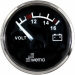 Analoginen volttimittari 12 V. Asennus-Ø 52 mm, asennussyvyys 55 mm, kokonais-Ø 62 mm. Vakiona punainen ja keltainen valaistus. Musta pohja / musta kehys.